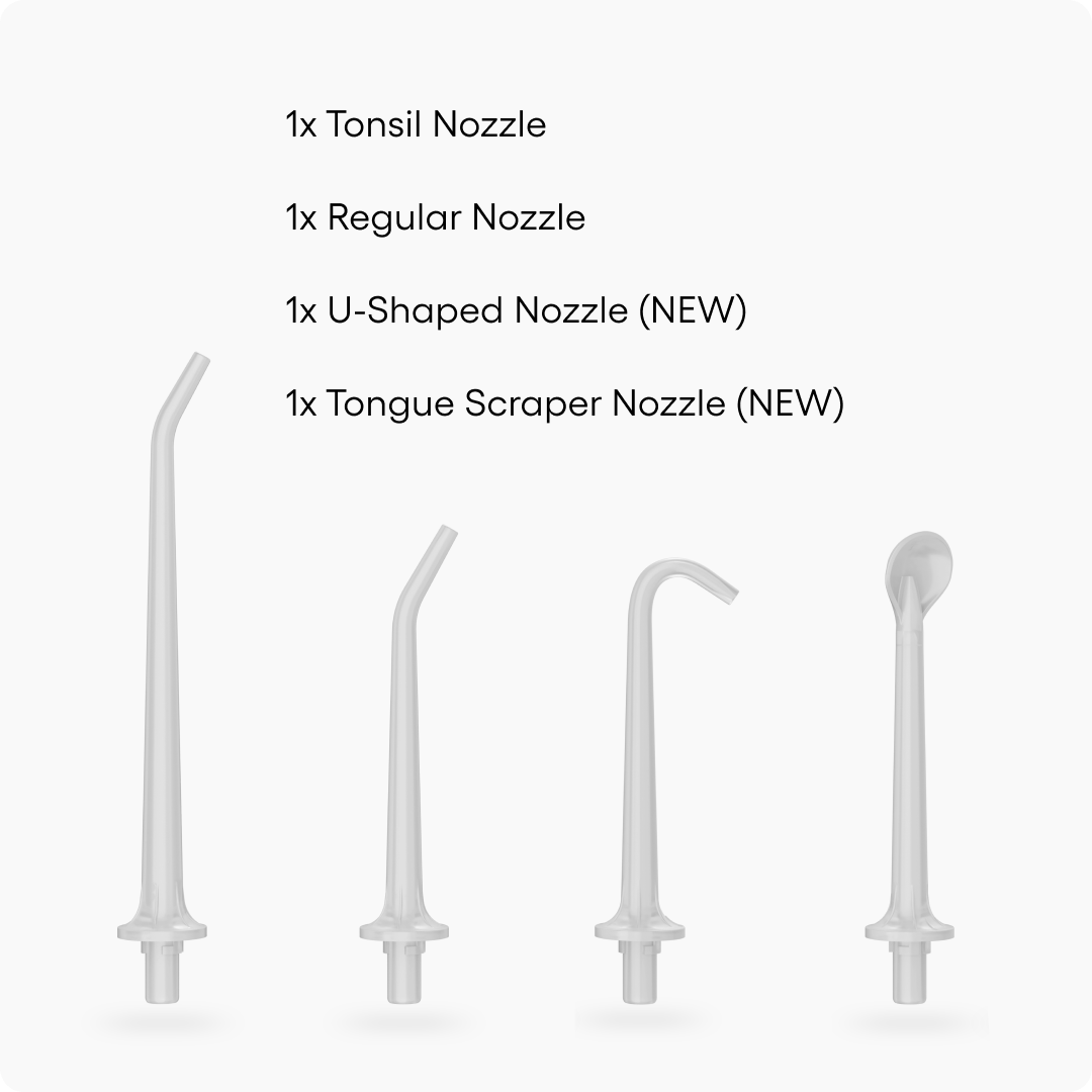 Most water flossers do one thing: blast water between your teeth. AquaClean Duo does two. A high-powered Flossing Mode for deep-cleaning between teeth, braces, implants, and crowns — and a unique Flushing Mode with an ultra-low-pressure soft motor designed to safely flush out tonsil stones, the #1 hidden cause of bad breath. V2 adds UV sterilization, a light attachment for visibility, and four nozzle types to handle every inch of your mouth. One device. Nothing left behind.