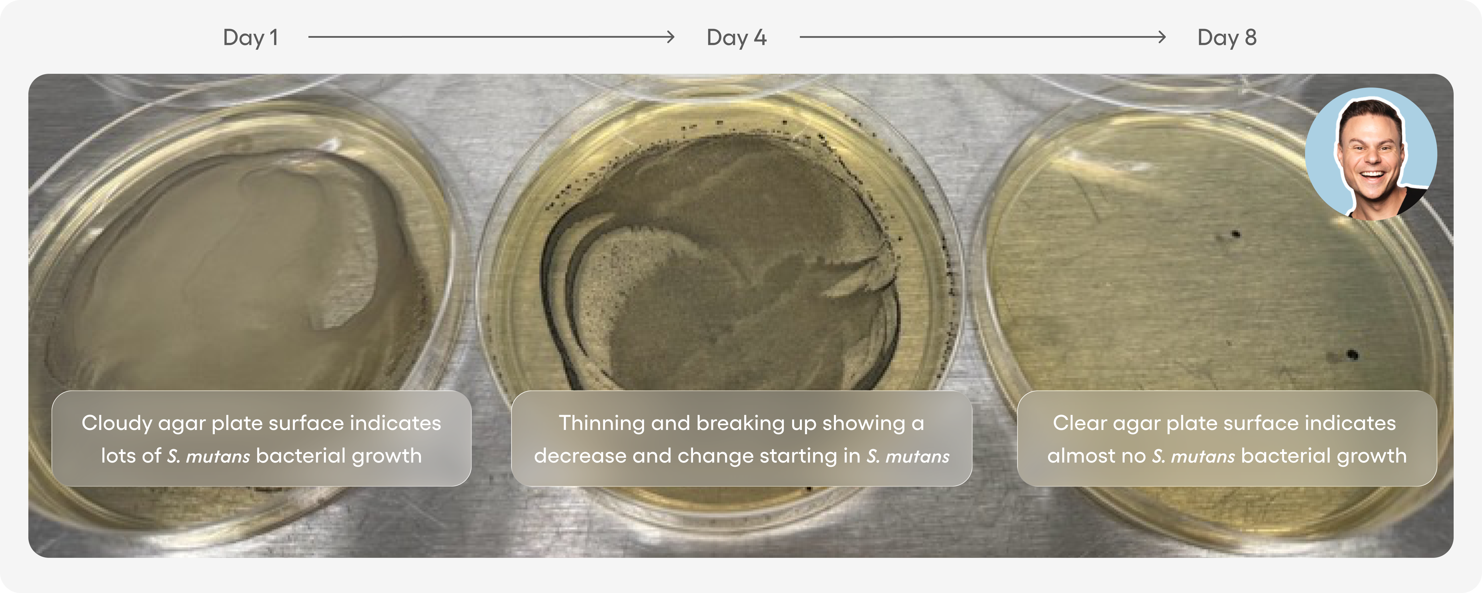 Dr. Winters tested his own saliva over 8 days while brushing with BioFuse™ Oil Matrix and saw near-complete elimination of S. mutans.