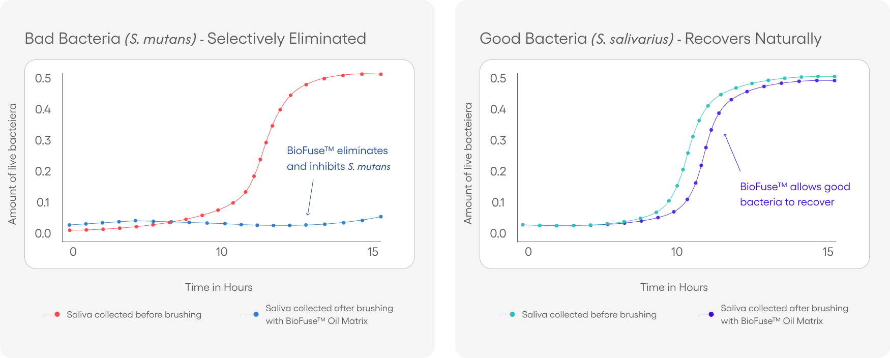 Saliva samples collected before and after brushing with BioFuse™ Oil Matrix showed highly selective elimination of only bad bacteria.