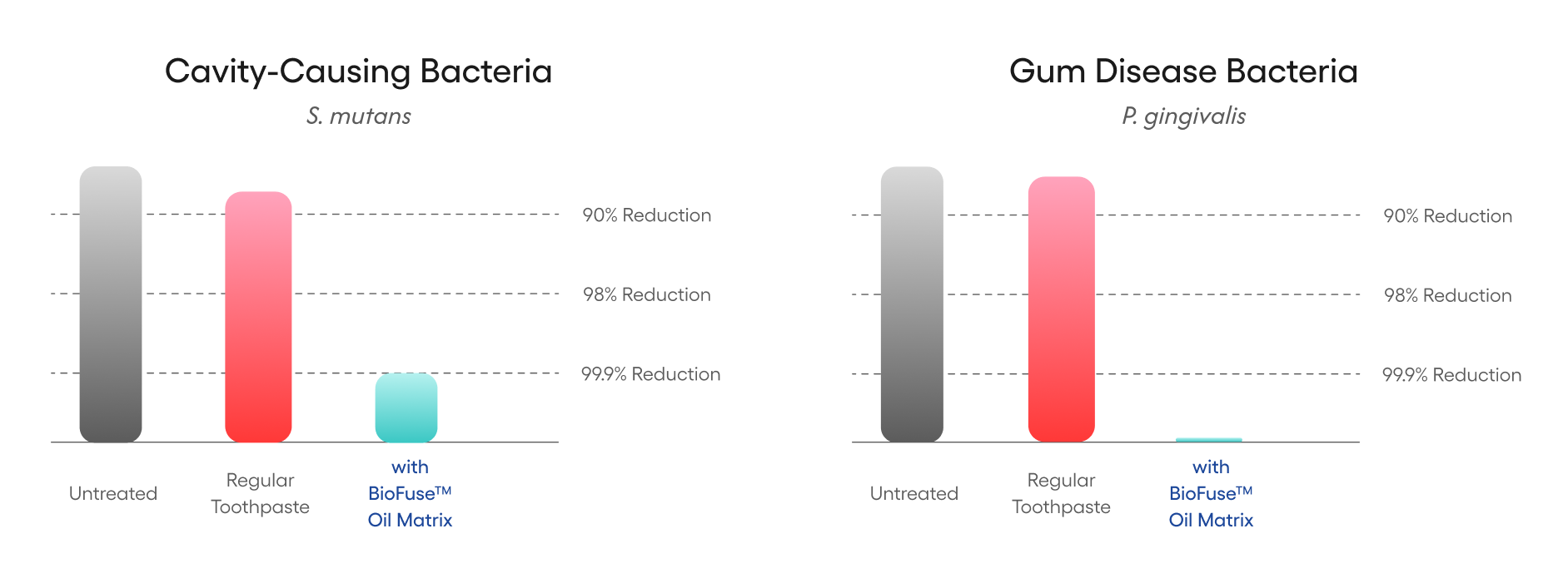 Clinical trial participants brushing with BioFuse™ Oil Matrix had ~50% less bad bacteria after 14 days.