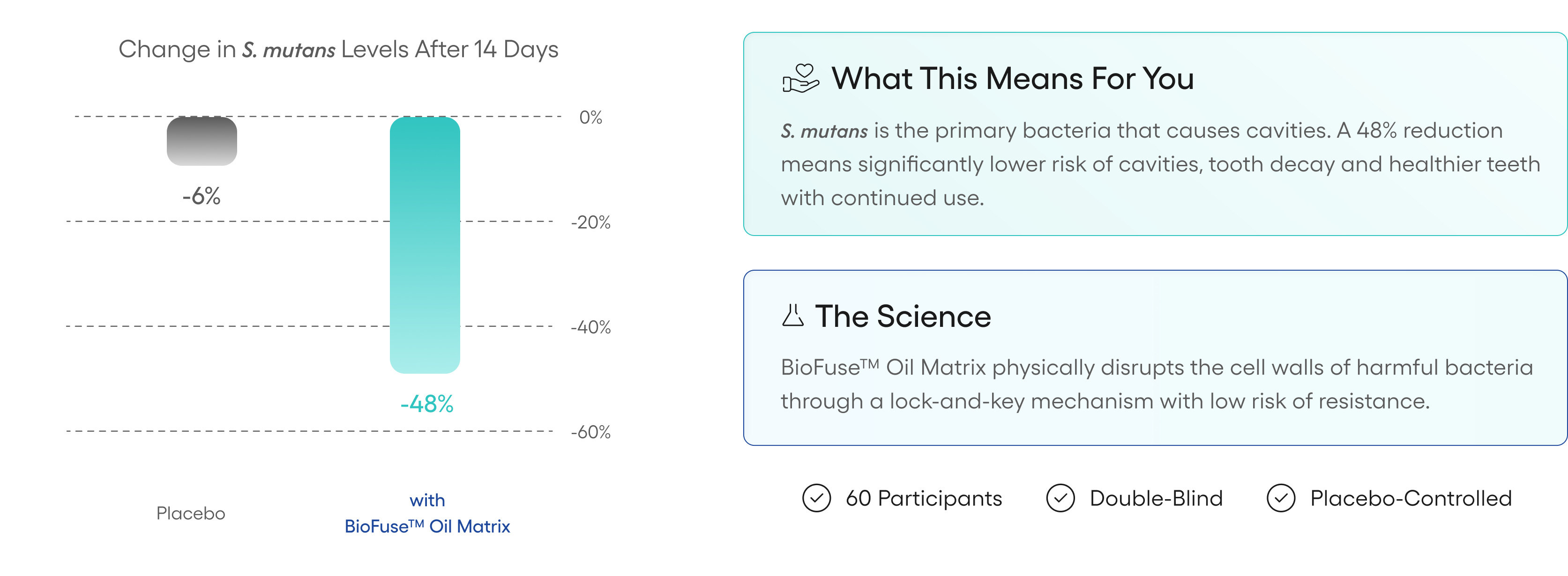 Clinical trial participants brushing with BioFuse™ Oil Matrix had ~50% less bad bacteria after 14 days.